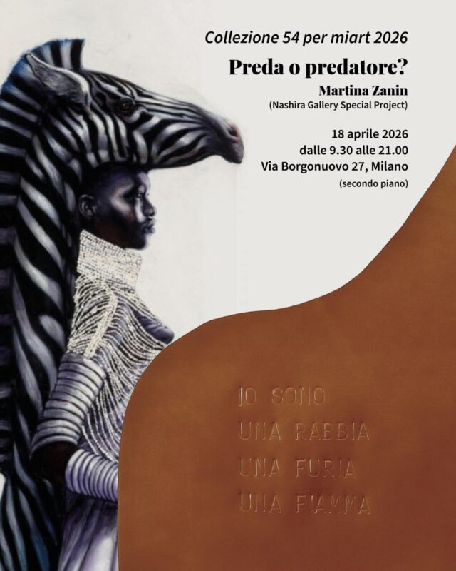 Nashira Gallery presenta uno special project dedicato a Martina Zanin all’interno del progetto di Collezione 54 per le private view di miart 2026, una riflessione sul rapporto tra preda e predatore e sui continui ribaltamenti di prospettiva che questa dinamica implica. Dalla natura alla società contemporanea, fino all’arte, questi ruoli si alternano e si confondono, generando tensioni e letture ambigue del presente. Le opere in mostra indagano questa relazione attraverso immagini e simboli in cui l’animale diventa metafora di emozioni, potere e vulnerabilità, restituendo una visione stratificata e attuale del tema.